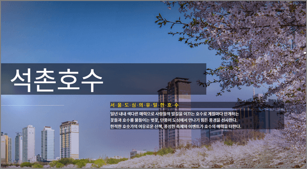 석촌호수는 호수 주변을 따라 흐드러지게 핀 벚꽃이 매력적인 곳이에요. 특히 호수에 반영된 벚꽃과 롯데월드타워가 어우러진 풍경이 정말 아름답죠.